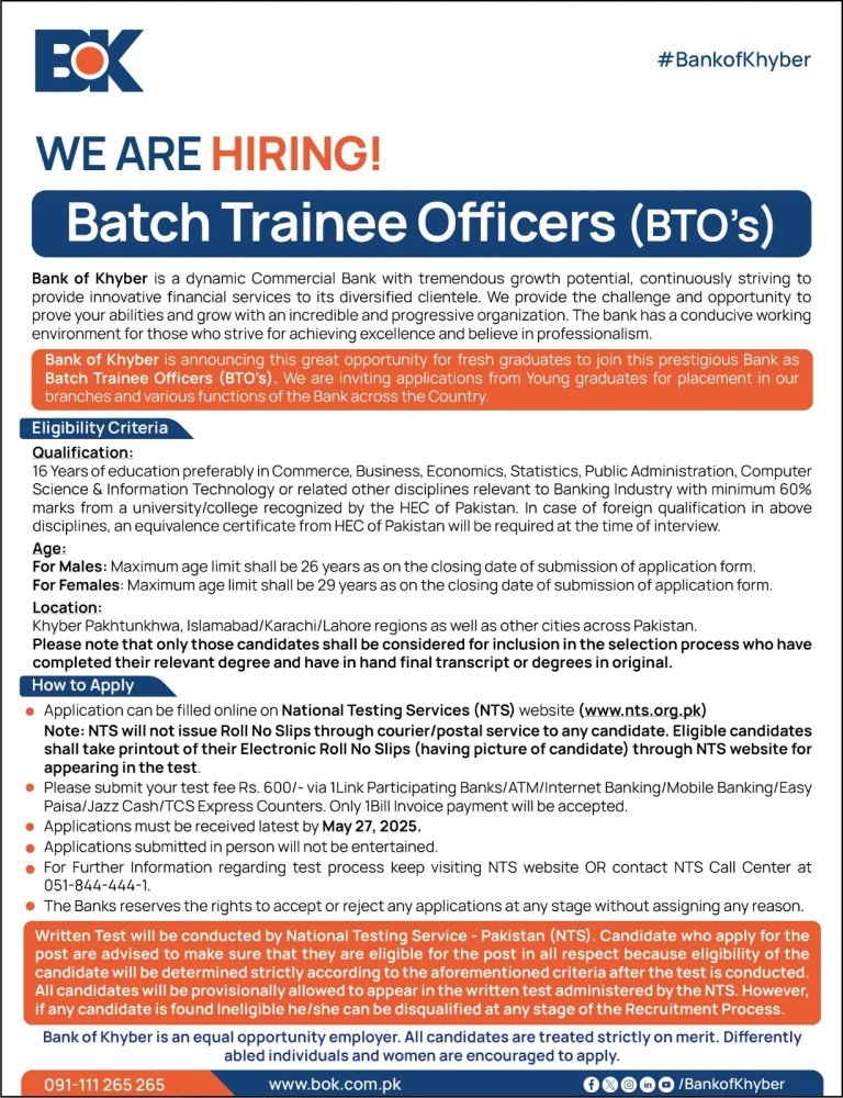 Latest BOK Jobs 2025 (June) Bank of Khyber is calling recent graduates to apply for its 2025 Batch Trainee Officer program. As a BTO, you’ll rotate through branches in Khyber Pakhtunkhwa, Islamabad, Karachi, Lahore, and other cities nationwide, gaining hands-on experience in retail banking, credit assessment, operations, and customer service. To be considered, you must hold 16 years of education in commerce, business, economics, statistics, public administration, computer science & IT, or a related field, with at least 60% marks from an HEC-recognized institution (equivalence certificate required for foreign degrees). This Bank of Khyber BTO vacancy offers a structured learning path, mentorship from senior officers, and a clear route to a permanent role.