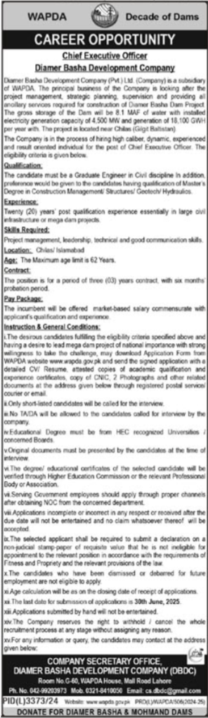 The Ministry of Water Resources, Government of Pakistan, is seeking to appoint a dynamic and visionary professional as the Chairman of the Water and Power Development Authority (WAPDA) on a five-year contractual basis. This high-profile leadership role is open to individuals with at least 25 years of professional experience, including a minimum of 8 years in a senior management or strategic role. Eligible candidates must hold a postgraduate degree in engineering, business administration, management, finance, or be a member of a recognized professional body, or a senior civil servant (BPS-21 or above).