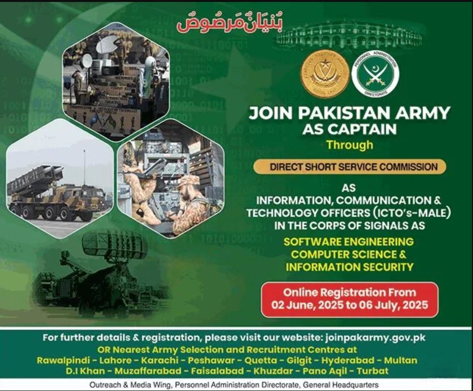 | Captain (Information, Communication & Technology Officer) | Software Engineering, Computer Science, Information Security | Direct Short Service Commission (DSSC) | Rawalpindi, Lahore, Karachi, Peshawar, Quetta, Gilgit, Hyderabad, Multan, D.I. Khan, Muzaffarabad, Faisalabad, Khuzdar, Pano Aqil, Turbat | 02 June 2025 – 06 July 2025 |