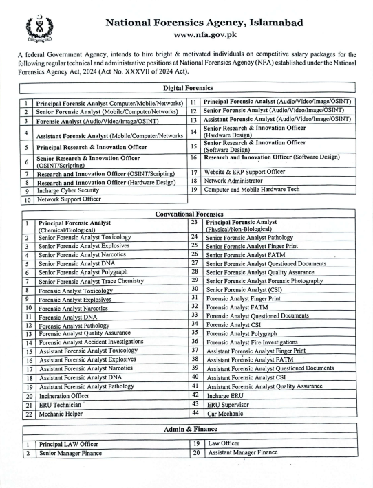 The National Forensics Agency (NFA), a newly created federal government organization under the National Forensics Agency Act 2024, is seeking applications from deserving, ambitious, and skilled professionals for various technical, scientific, and administrative positions. The NFA has its headquarters in Islamabad and will be the foremost authority in Pakistan for forensic science, digital forensics, forensic investigations, and research-based innovation.