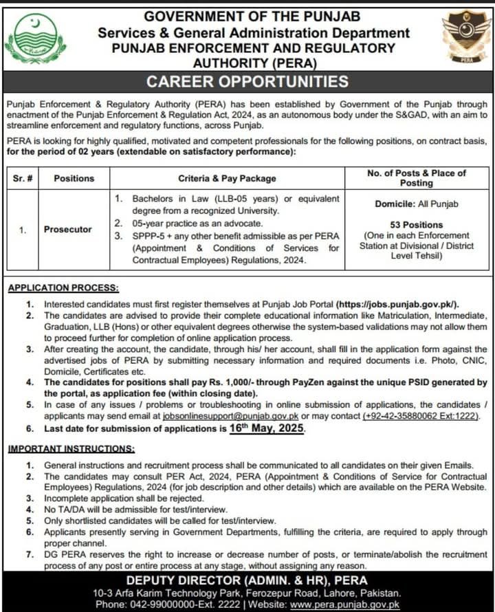 The Government of Punjab, under the Services & General Administration Department, has established the Punjab Enforcement and Regulatory Authority (PERA) through the Punjab Enforcement & Regulation Act, 2024. This autonomous body is designed to streamline and strengthen enforcement and regulatory activities across the province. As part of its expansion, PERA is now inviting applications from dynamic, competent, and dedicated professionals for the position of prosecutor on a contract basis for an initial period of two years, which may be extended based on satisfactory performance.