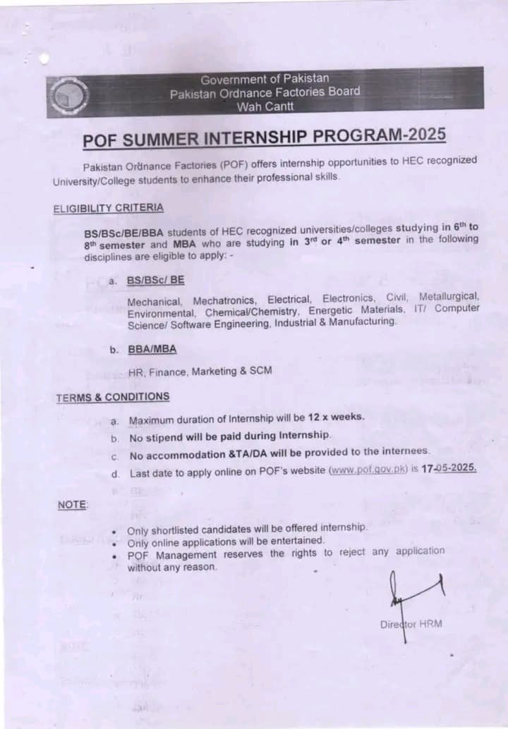 POF Summer Internship 2025 is a golden opportunity for Pakistani students who want to gain real-world industrial experience at one of the country’s most prestigious defense organizations—Pakistan Ordnance Factories (POF), Wah Cantt. Every year, POF opens its doors to bright and passionate students who are looking to enhance their academic knowledge with practical exposure in a professional, secure, and highly disciplined environment.