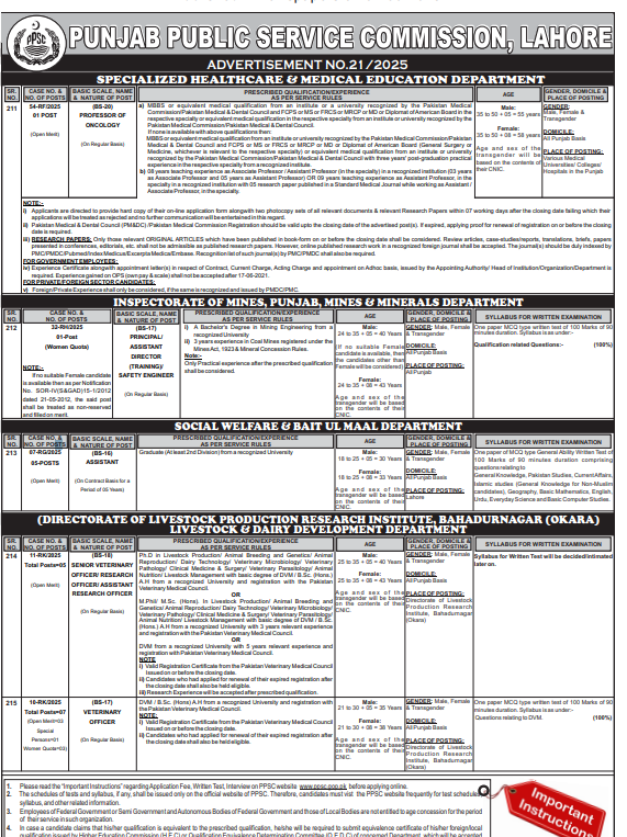 The Punjab Public Service Commission (PPSC) has announced a variety of posts across several government departments. Positions range from BS-16 to BS-20 and include teaching, technical, administrative, and veterinary roles.