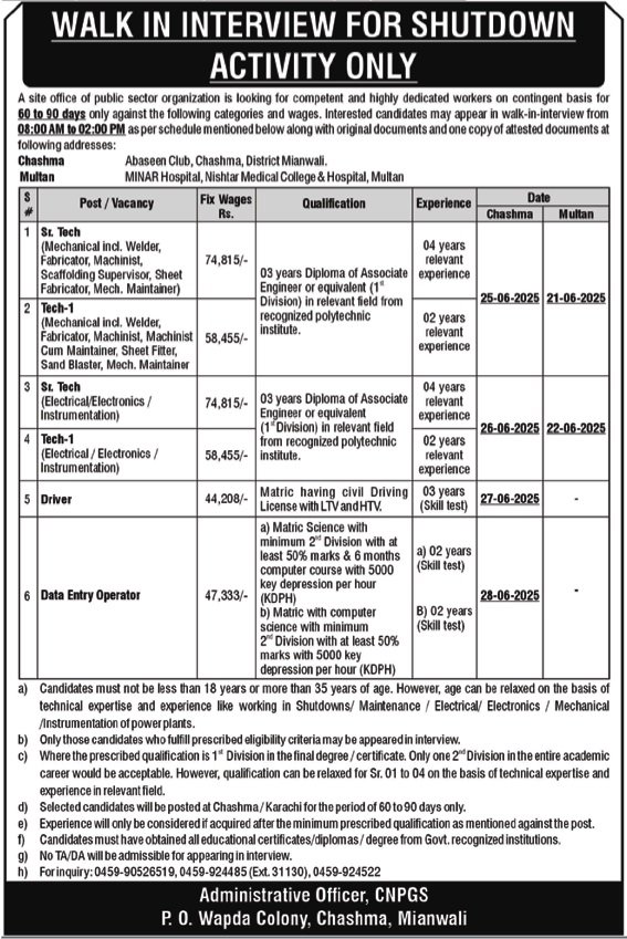 26 June 2025: Sr. Tech (Electrical/Electronics) — Multan & Chashma